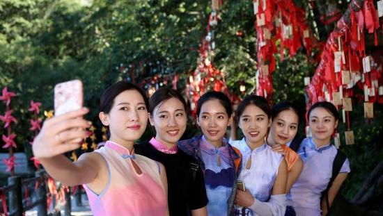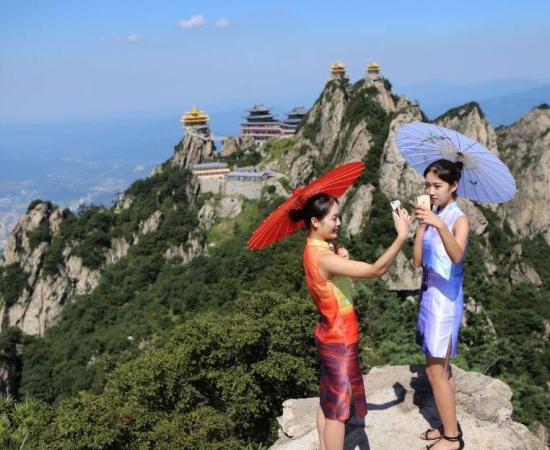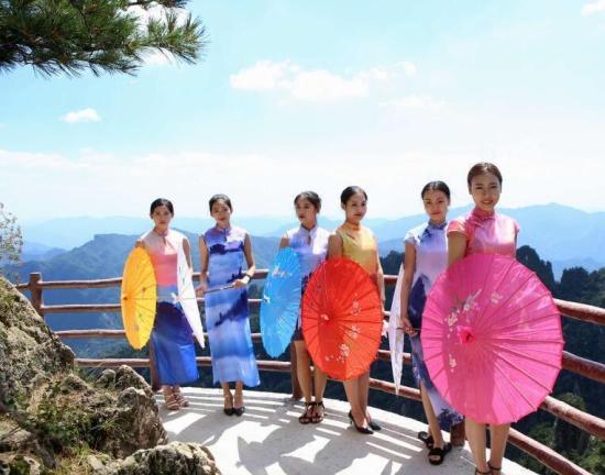 8月28日,河南洛阳老君山悬崖栈道,几名女子身穿老君山“风景旗袍”在实景中走秀。中新社