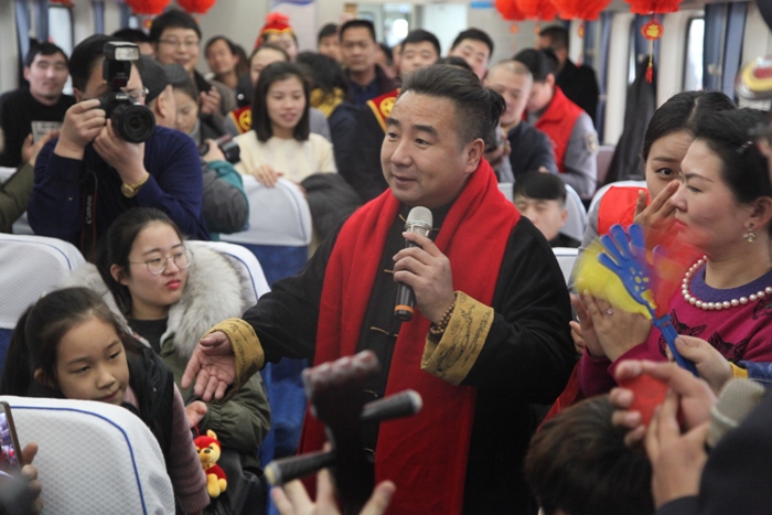 2月1日,是2018年春运的第一天。河南省曲剧艺术保护传承中心的国家一级演员刘青、曲剧名家田冠军、曲胡演奏员邵元克三人和郑州客运段北京一队K4080的列车员以及书法家一起,在火车上为回家的旅客送去新年的祝福。